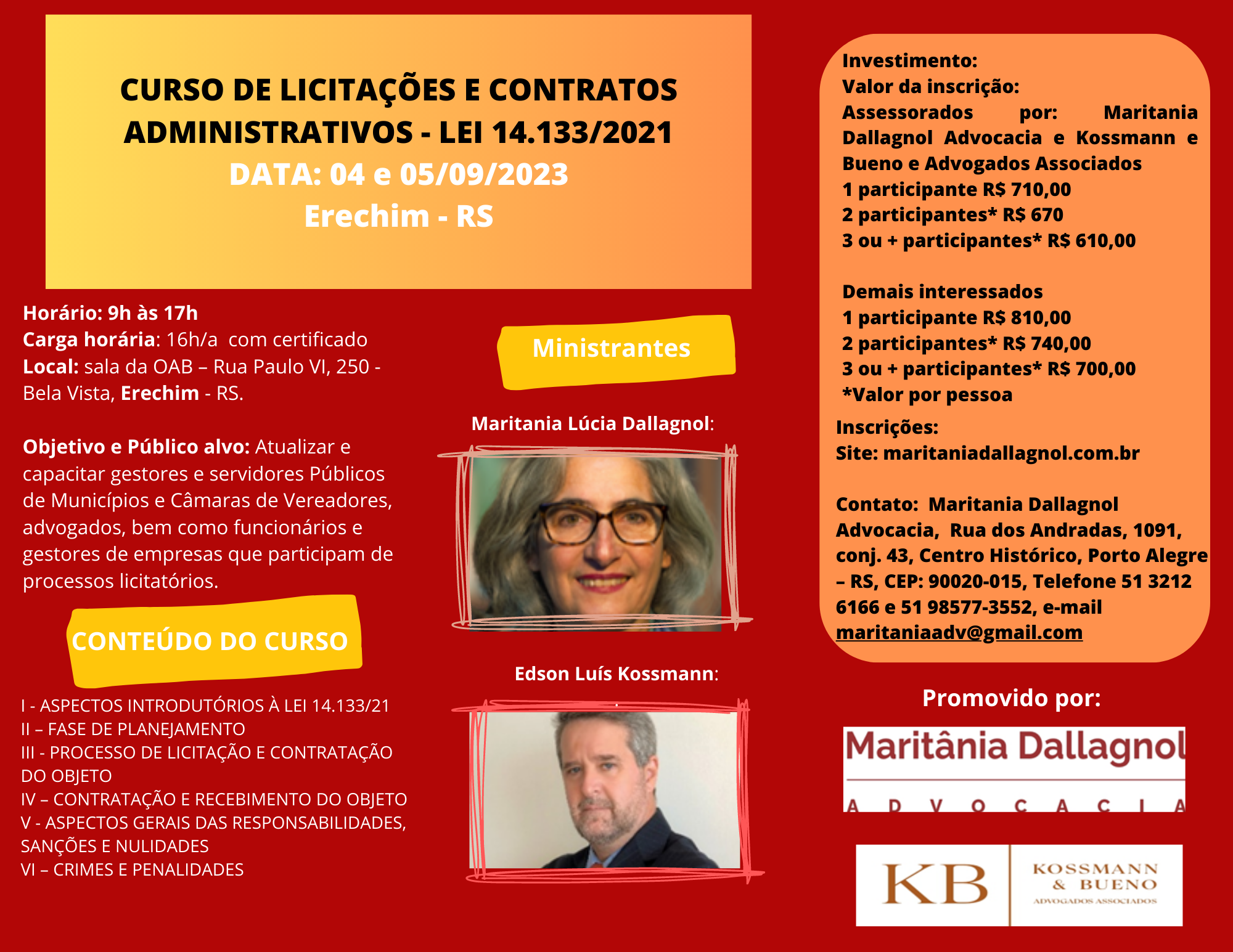 CURSO DE LICITAÇÕES E CONTRATOS ADMINISTRATIVOS – LEI 14.133/2021 Dias e horários: 04 e 05/09/2023, das 9h às 17h Carga horária – 16h/a Local: sala da OAB em Erechim – […]